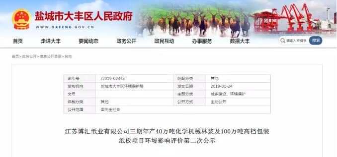 導語:江蘇省鹽城市大豐區人民政府在今年初公示了江蘇博匯紙業有限公司三期年產40萬噸化學機械林漿及100萬噸高檔包裝紙板項目環境影響評價文件。該項目投資總額38.3億元,預計2020年12月投產。