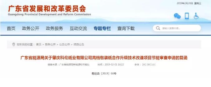 廣東省能源局新能源和節能處于2月初發布了關于“廣東省能源局關于肇慶科倫紙業有限公司高檔包裝紙合作升級技術改造項目節能審查申請的復函”。廣東省能源局對企業上報的《肇慶科倫紙業有限公司高檔包裝紙合作升級技術改造項目節能報告》和《關于做好肇慶科倫紙業有限公司高檔包裝紙合作升級技術改造項目節能工作的承諾書》進行了程序性審查,認為該項目節能報告編制符合國家有關規范要求,同時,還將依據《節能監察辦法》(國家發展改革委2016年第33號令),視情組織對本項目節能審查意見落實情況開展節能監察。
