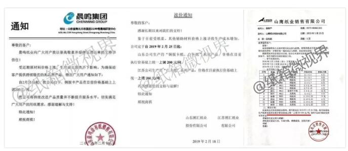 博匯紙業(yè)在2月18日發(fā)布的漲價函顯示,2019年2月25日起:山東公司生產(chǎn)的“銅版卡紙、白卡紙”系列產(chǎn)品,價格在目前執(zhí)行價基礎(chǔ)上統(tǒng)一上調(diào)200元噸。江蘇公司生產(chǎn)的“白卡紙”系列產(chǎn)品,價格在目前執(zhí)行價基礎(chǔ)上統(tǒng)一上調(diào)200元/噸。