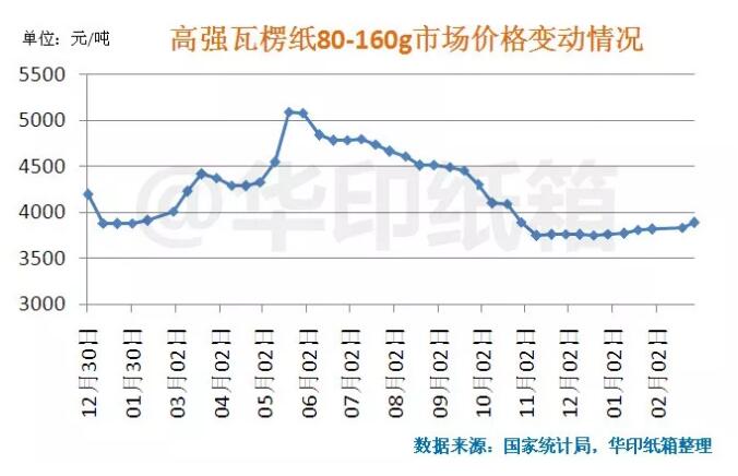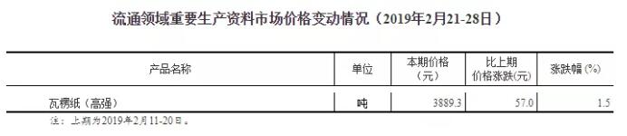 導語:2019年3月4日,國家統計局公布最新一期流通領域重要生產資料市場價格變動情況(2019年2月21-28日),數據顯示截至2月28日,80-160g高強瓦楞紙的參考價格已經上漲到3889.3元/噸。