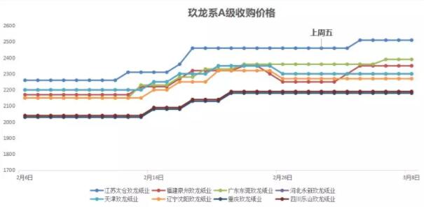 上周理文系一級紙收購價格對比上周五略有上漲。其中東莞理文一級紙在本周上漲了100元/噸,重慶理文上漲了40元/噸,江西理文則與3月1日價格持平。 截止3月8日,理文系一級紙以東莞理文最高,為2360元/噸;重慶理文最低,為2230元/噸。 3、玖龍系A級收購價格走勢