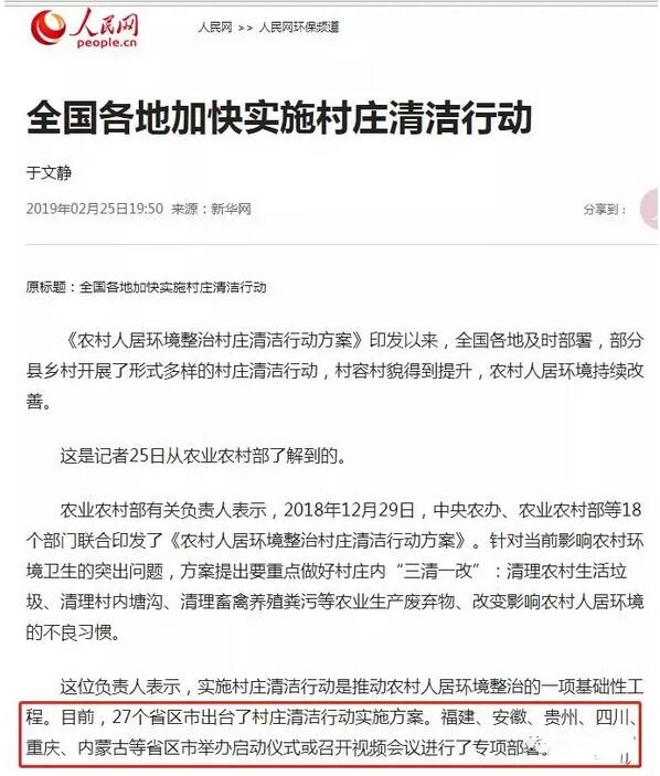 2月25日人民網發布,自《農村人居環境整治村莊清潔行動方案》印發以來,已有27個省區市出臺了村莊清潔行動實施方案。福建、安徽、貴州、四川、重慶、內蒙古等省區市舉辦啟動儀式或召開視頻會議進行了專項部署。