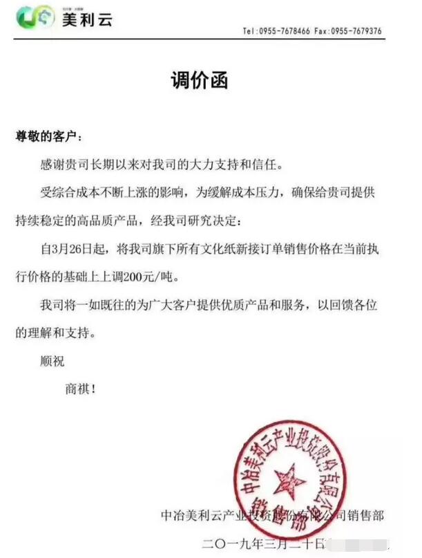 山東泉林集團有限公司:鑒于目前原材物料、能源等各種造紙原輔材料價格不斷上漲,為緩解企業生產運營成本壓力,持續為您提供優質的產品和服務,經公司研究決定,自2019年3月20日起,我公司精制膠版印刷紙上調300元/噸,其它所有品牌文化用紙價格統一上調200元/噸。