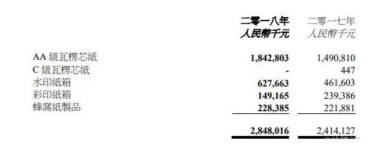 按主要產品收入情況來看,AA級瓦楞芯紙收入18.42億元,水印紙箱收入6.28億元,彩印紙箱1.49億元,蜂窩紙制品2.28億元。