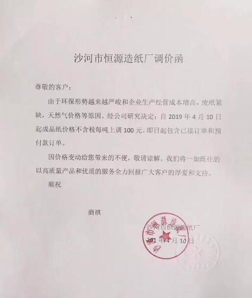沙河市邢臺市恒源造紙廠:由于環保形勢越來越嚴峻和企業生產經營成本增高,廢紙緊缺,天然氣價格等原因,公司決定自4月10日起成品紙價格不含稅每噸上調100元。