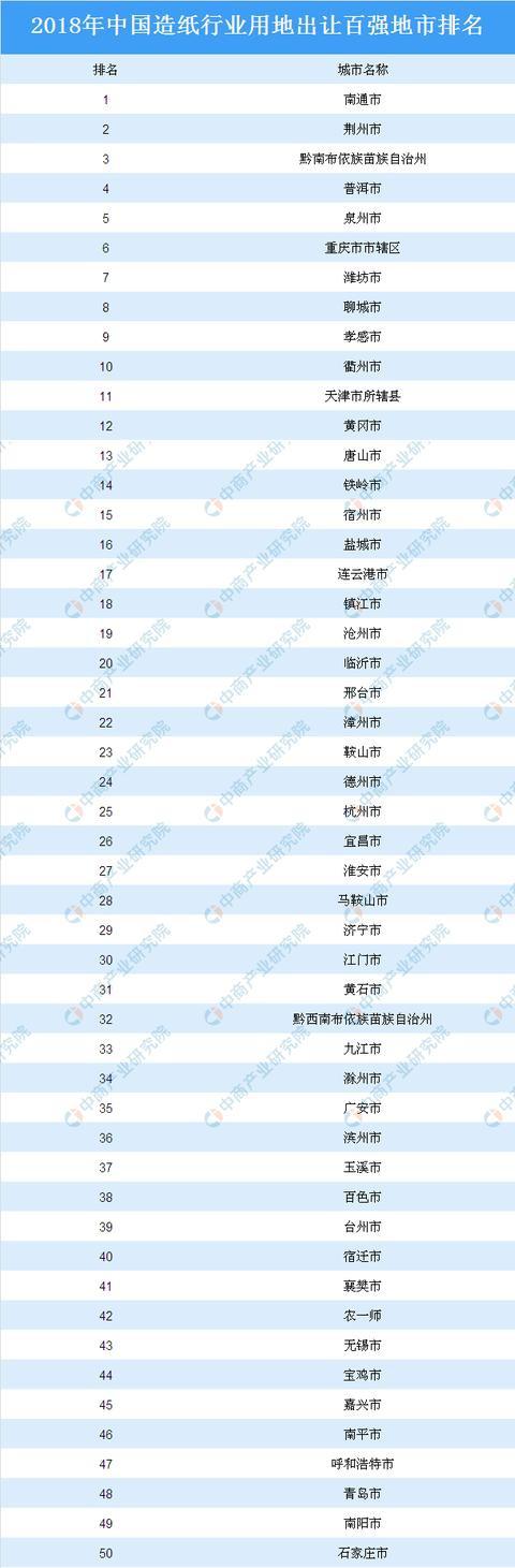 據(jù)榜單顯示,進入榜單前十的城市分別為:南通市、荊州市、黔南布依族苗族自治州、普洱市、泉州市、重慶市市轄區(qū)、濰坊市、聊城市、孝感市、衢州市。其中,南通市2018年造紙行業(yè)用地出讓面積排名全國第一,面積達2382畝,遙遙領先于其他企業(yè)。值得提出的是,南通市是2018年中國造紙行業(yè)用地出讓100強地市中唯一一個造紙行業(yè)用地出讓面積超2000畝的城市。荊州市和黔南布依族苗族自治州則分別排名第二和第三,其造紙行業(yè)用地出讓面積分別為1143畝和873.6畝。