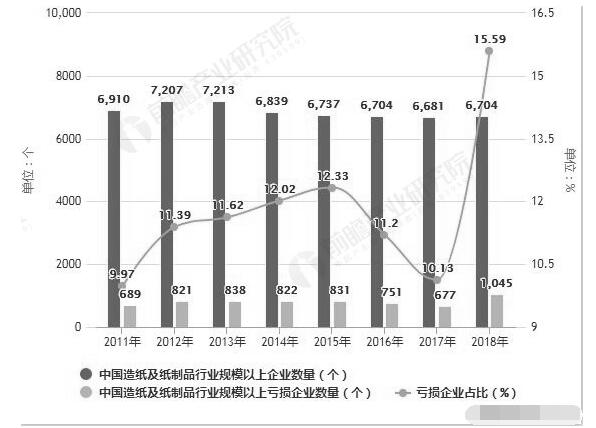 數據來源:前瞻產業研究院整理 受供給側改革、環保政策等影響,虧損企業數量增加 受供給側改革、環保政策影響,龍頭企業優勢愈發凸顯。但幾家歡喜幾家愁,部分企業一時無法應付環保重壓、生產線停產等局面,再加上下游需求放緩、中美貿易戰等沖擊,企業面臨虧損狀態。根據國家統計局數據,2018年中國造紙及紙制品行業規模以上企業數量增加至6704家,虧損企業數量大幅增加,高達1045家;虧損企業數量占比增至15.59%。 除虧損狀態外,還有部分企業不堪重負,紛紛倒閉、破產。如浙江的富陽市金昌紙業有限公司、杭州富陽金昌紙業有限公司、廣西的賀達紙業、山東的匯鑫公司。 2011-2018年中國造紙及紙制品行業規模以上企業、虧損企業數量統計及增長情況