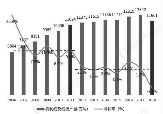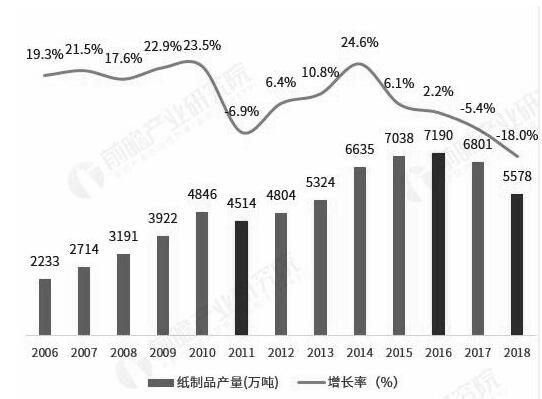 數據來源:前瞻產業研究院整理 對比2011年和2018年全國各省市機制紙和紙板的生產情況發現,紙和紙板制造企業主要集中在廣東、山東和浙江三個沿海地區,只是排名發生了改變,制造中心從山東轉移至廣東;地區集中度也有所提高,2011年前三甲地區的集中度為43.98%,2018年增至51.43%。 此外,河南和河北地區紙和紙板制造企業陸續遷出,產量下降明顯;河南省最為突出,2010年產量占比達10.71%,全國排名第四,2018年產量占比僅3.25%。這主要是由于河南地區的造紙行業大型集團少、強勢企業少,大部分造紙企業規模較小,企業平均規模8萬t/a,在中美貿易戰和環保政策的壓力下,企業無法維持正常生產狀態;2017年河南的紙和紙板產量為697.5萬噸,僅一年時間產量就減少了300多萬噸。 2011年機制紙及紙板制造企業分布相對較為分散,內陸和沿海地區均有分布,如山東、浙江、廣東、河南和河北等多地區;而2018年,產量主要來源于浙江、山東、廣東、江蘇和福建地區,全部集中在沿海地區。這主要是考慮到造紙的上游紙漿的三大來源——國產木漿、國產廢紙漿和進口紙漿,即木漿主要產地集中在山東,國產廢紙漿主要集中在華東和華南地區,沿海進口紙漿具備交通便利、節約成本等優勢。 2、紙制品產業遷移路徑:向內陸地區遷移 在上游受紙和紙板制造企業供給、下游受消費需求、自身受環保政策的多重影響下,紙制品的產量變化呈現出周期性特征。根據國家統計局統計數據顯示,2006-2010年,紙制品產量連續5年高速增長;2011年產量首次下降后,2012-2016年產量又連續五年逐年遞增;2017-2018年,產量又開始下降。 2006-2018年中國紙制品產量統計及增長情況