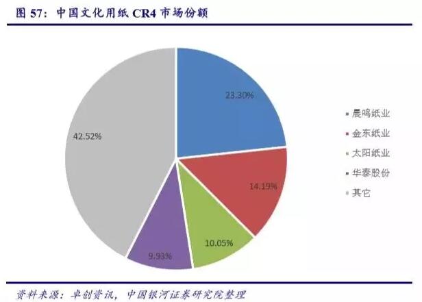 文化用紙的市場集中度相對較高,按照2018年各公司的產能數據,在行業市場份額占比的較大的公司依次是晨鳴紙業、金東紙業、太陽紙業、華泰股份,除金東紙業外,其他三家均已上市,晨鳴紙業和太陽紙業更是國內目前漿紙系的龍頭企業。晨鳴紙業目前在山東、廣東、湖北、江西、吉林、武漢等地均建有生產基地,年漿紙產能達到1100多萬噸。根據2018年各公司的產能數據測算,文化用紙行業的CR4為57.48%,CR8為72.74%,CR10為76.40%,相較于其它細分紙種,文化用紙的市場集中度相對更高。