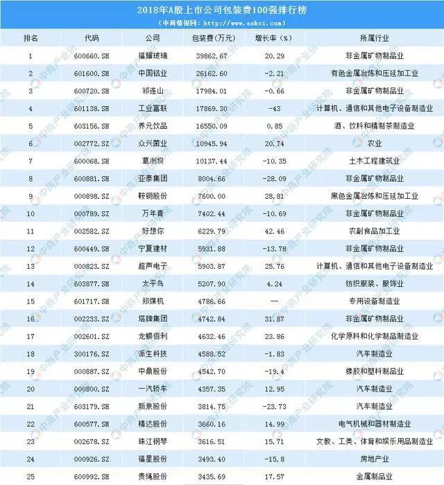 目前,上市公司2018年年報已基本披露完畢。據(jù)中商產(chǎn)業(yè)研究院大數(shù)據(jù)庫數(shù)據(jù)顯示,2018年上市公司整體表現(xiàn)良好。其中,2018年上市公司包裝費用排名中,福耀玻璃以近4億元位居第一;中國鋁業(yè)排名第二,包裝費用達2.62億元;祁連山排名第三,包裝費用為1.8億元。