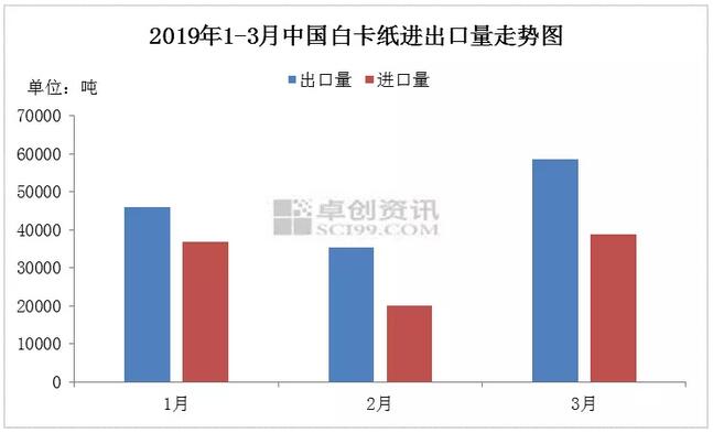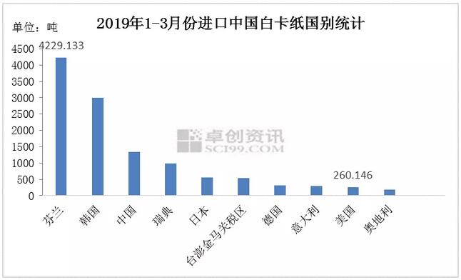 2019年1-3月份中國白卡紙進出口量走勢一致,由于中國白卡紙產(chǎn)量可滿足白卡紙市場的需求,所以進口量相對要小于出口量。2019年1-3月份的中國白卡紙的出口總量為14萬噸左右。2019年1-3月份白卡紙的進口總量僅為1.18萬噸。 2、2019年1-3月份白卡紙進口國別情況
