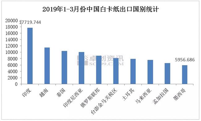 上圖為2019年1-3月份中國白卡紙進口量排名前十國家統(tǒng)計,美國排在第9位,進口量僅為260.146噸。雖然在中美貿(mào)易爭端加劇之后,中國宣布自2019年6月1日0時起,對已實施加征關(guān)稅的600億美元清單美國商品中的部分,提高加征關(guān)稅稅率,分別實施25%、20%或10%加征關(guān)稅。其中白卡紙(稅則號為48102900,簡稱為其他高嶺土及其他無機涂布書寫、印刷,機械纖維>10%)也在其列,加征關(guān)稅20%,但是因其量較少,因此對國內(nèi)白卡紙影響較小。 3、2019年1-3月份白卡紙出口國別情況分析