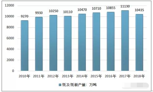 資料來源:證監會、智研咨詢整理 近年來我國經濟的快速發展和居民生活水平的不斷提高,紙制品需求日益增大,從而帶動作為造紙原料的紙漿需求的上漲。據統計,2012年以來我國國內紙及紙制品產量維持在1億噸以上。 2010-2018年我國紙及紙板產量走勢圖