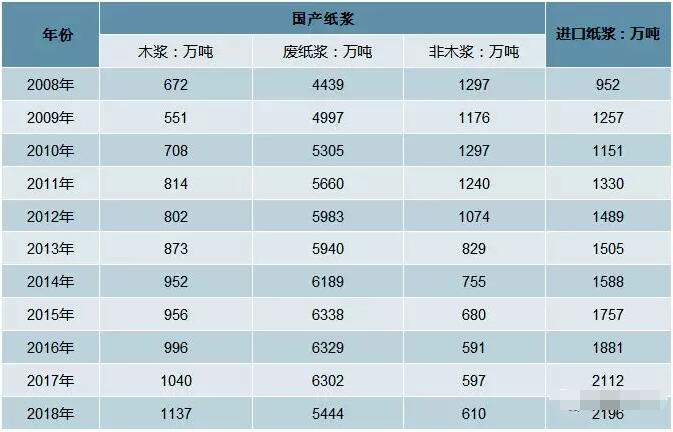 資料來源:智研咨詢整理 我國紙漿消費量位居全球第一,產量僅次于美國,居全球第二位,未來我國造紙產業還有巨大的發展空間。造紙工業發展是以森林資源可持續發展為基礎,而目前我國的森林資源遠不能滿足日益發展的制漿造紙工業的需要,為彌補原料供應的不足,每年要從國外進口相當數量的紙漿,我國已經成全球第一大進口國。 據統計2008年以來除2013年以及2018年國內需求下降以外,其余年度均保持增長態,2008年以來我國紙漿年均消耗增速超過2.5%;總體而言我國紙漿的消耗依然是以國產為主,進口紙漿為輔。其中國產紙漿消耗量近年來逐漸趨于穩定,然而每年通過進口而消耗的紙漿總量卻在逐年增加,2018年我國進口紙漿消耗總量創歷史新高,達到2196萬噸。 2008-2018年我國進口紙漿消耗量統計圖