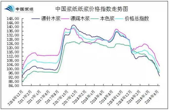 本周(6.10-6.14)中國漿紙紙漿價格總指數下滑2.19%至97.72點。本周紙漿市場需求未有改善,成交低迷。與上周相比,本周紙漿現貨價格繼續走低,但周內貿易商報價基本持穩,并未出現連續下調。外盤方面,6月份紙漿外盤有大幅下調,周內又聽聞有更低價成交。