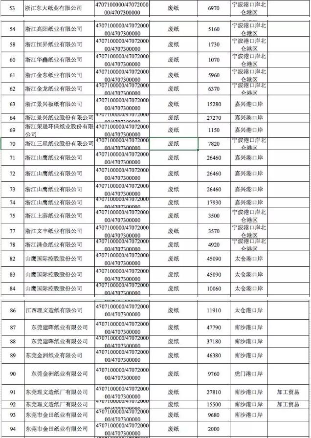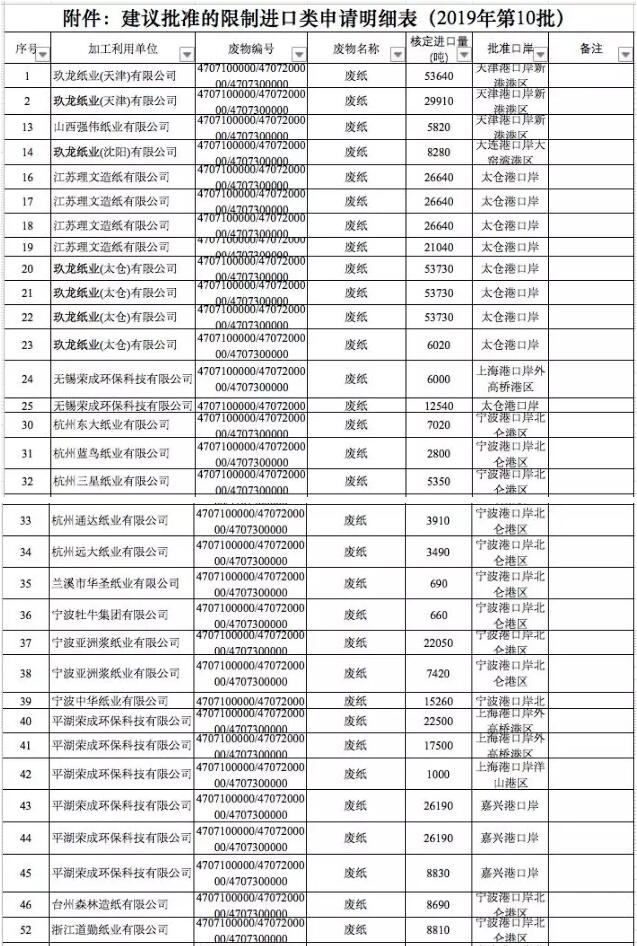 2019年第十批限制類進口公示表顯示 廢紙核準總量為168.7070萬噸