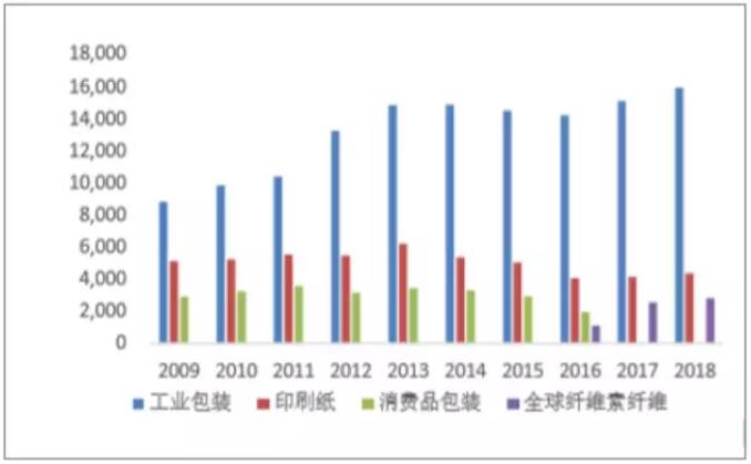 數據來源:公開資料整理 美國造紙行業業務模式:拓展上下游業務,全球布局產能 美國造紙行業經過多年的發展,目前在業務模式上體現出兩方面的特點:其一是在產業鏈方面,美國的造紙行業龍頭已經實現了制漿、造紙、包裝一體化布局;其二是在生產布局上,美國的龍頭企業也實現了全球布局,制紙業務遍布全球。 以美國造紙行業的絕對龍頭國際紙業為例,國際紙業主營業務結構較為穩定,主要分為工業包裝、全球纖維素纖維、印刷紙、消費品包裝,其中,工業包裝主要從事箱板瓦楞紙生產,其中部分業務會涉及到下游的包裝業務;全球纖維素纖維提供用于吸收型、非吸收型的專業紙漿、纖維,屬于上游的制漿業務;消費品包裝用于各種包裝和食品服務終端用途的涂層紙板,也會涉及到下游的包裝業務。 國際紙業作為全球最大的箱板瓦楞紙生產商,經過前期的野蠻擴張,業務在2006年之后已經比較集中在造紙業務。但即便如此,其仍積極布局上游的制漿及下游的包裝業務,2016年5月,國際紙業收購惠好公司旗下的紙漿制造業務,進一步完善產業鏈布局。截止2018年,國際紙業擁有箱板瓦楞紙產能1300萬噸,印刷紙產能超過400萬噸,制漿產能超過340萬噸。包裝和制漿合計占據了公司20%以上的業務。 國際紙業細分業務營收(單位:百萬美元)
