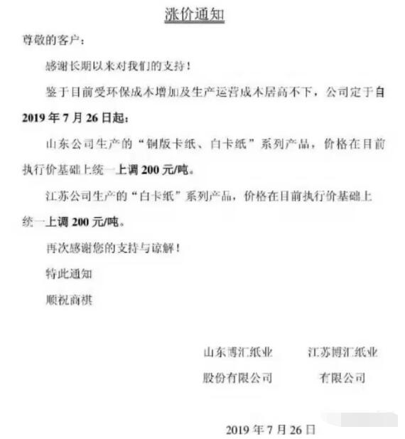 山東博匯/江蘇博匯紙業:鑒于目前受環保成本增加及生產運營成本居高不下,公司定于自2019年7月26日起:山東公司生產的“銅版卡紙、白卡紙”系列產品,價格在目前執行價基礎上統一上調200元/噸。江蘇公司生產的“白卡紙”系列產品,價格在目前執行基礎上統一上調200元/噸。