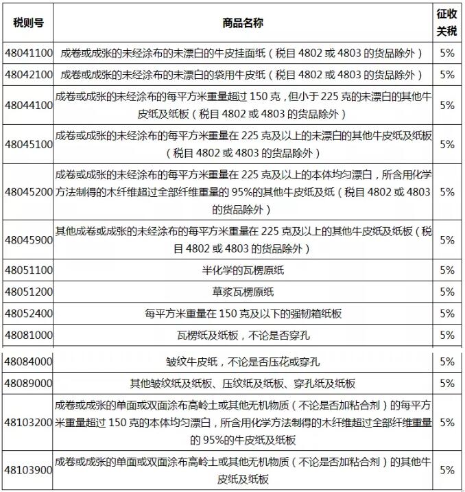 此外,9月1日及12月15日加征關稅的名單中,還涉及與6月1日重復加稅的48043100和48044900兩個稅則號。兩個稅則號6月份關稅為20%,9月份加征關稅10%,總關稅為32%。