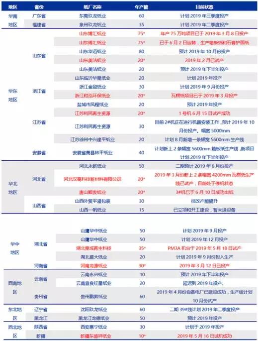 目前箱板瓦楞紙行業(yè)集中度較低,一方面龍頭紙企紛紛擴建產(chǎn)能,旨在快速提升市占率,全國布點擠出區(qū)域性中小產(chǎn)能,另一方面漿紙系紙企希望,把握箱板瓦楞紙需求增長機遇,紛紛投建箱板瓦楞紙項目。 數(shù)據(jù)顯示,2018年玖龍、理文、山鷹前三大紙企合計產(chǎn)能 2109 萬噸,占全行業(yè)產(chǎn)能 6722 萬噸的31%。因此短期內(nèi)新增產(chǎn)能的密集投放,對于行業(yè)供需格局形成一定壓力。 2019 年箱板瓦楞紙行業(yè)在建產(chǎn)能情況
