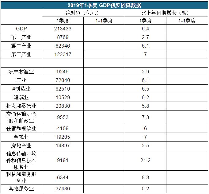 (數(shù)據(jù)來源:國家統(tǒng)計局) 2019年1季度 GDP初步核算數(shù)據(jù)