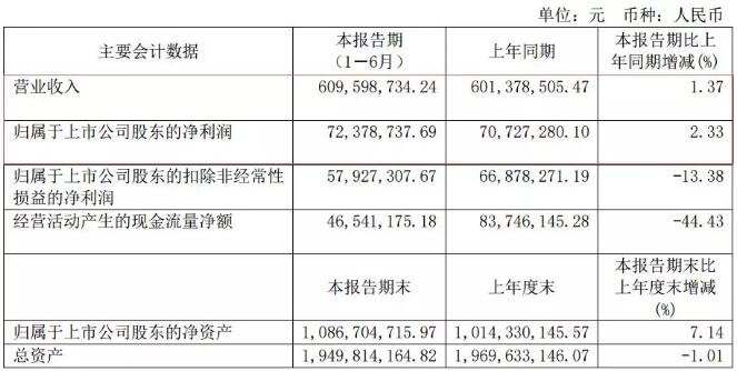 8月29日,浙江大勝達包裝股份有限公司發布了今年半年度報告,實現營收6.09億元,較上年同期上升1.37%;實現歸屬于上市公司股東的凈利潤7237.87萬元,較上年同期增長2.33%。