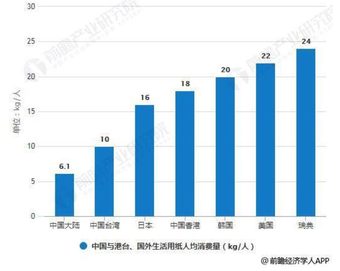 數據來源:前瞻產業研究院整理 國內生活用紙行業仍有較大提升空間 同時,隨著經濟的發展及消費水平提升,國內生活用紙人均消費量由2009年的2.1kg/人上升至2017年的6.1kg/人,但對比港臺及國外水平(臺灣10kg/人,日本16kg/人,香港18kg/人,韓國20kg/人,美國22kg/人,瑞典24kg/人),仍有較大提升空間。 中國與港臺、國外生活用紙人均消費量對比情況