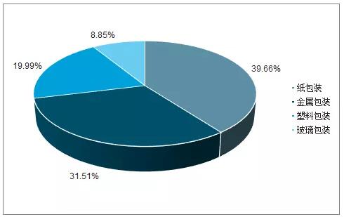2018-2023年包裝行業(yè)銷(xiāo)售收入及預(yù)測(cè) 中國(guó)包裝市場(chǎng)合計(jì)營(yíng)收9433.74億元,紙和紙板制造占比39.66% 目前,中國(guó)市場(chǎng)上應(yīng)用最廣泛的是紙質(zhì)包裝和塑料包裝產(chǎn)品,其次是金屬包裝和玻璃包裝。 據(jù)調(diào)查數(shù)據(jù)統(tǒng)計(jì)顯示,紙包裝、塑料包裝、金屬包裝和玻璃包裝合計(jì)實(shí)現(xiàn)營(yíng)業(yè)收入9433.74億元,紙和紙板制造占整個(gè)包裝主營(yíng)業(yè)務(wù)收入的39.66%。 中國(guó)包裝行業(yè)細(xì)分市場(chǎng)營(yíng)銷(xiāo)占比