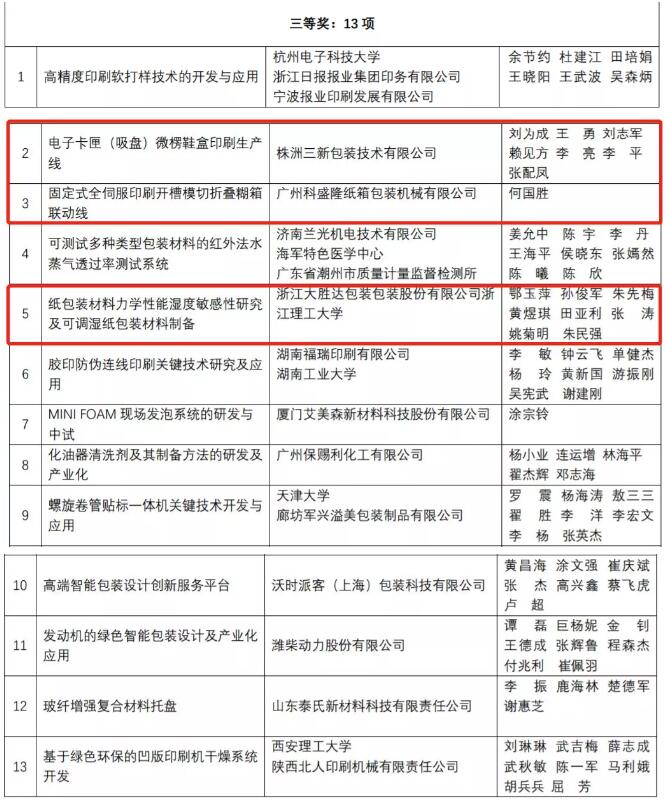 小編整理發(fā)現(xiàn),株洲三新包裝技術有限公司“電子卡匣(吸盤)微楞鞋盒印刷生產線”,廣州科盛隆紙箱包裝機械有限公司“固定式全伺服印刷開槽模切折疊糊箱聯(lián)動線”,以及浙江大勝達包裝股份有限公司/浙江理工大學“紙包裝材料力學性能濕度敏感性研究及可調試紙包裝材料設備”,分別獲三等獎。