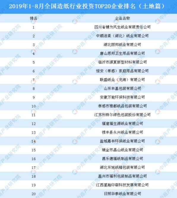 據(jù)中商產(chǎn)業(yè)研究院產(chǎn)業(yè)地產(chǎn)情報(bào)庫(kù)監(jiān)測(cè)數(shù)據(jù)顯示,2019年1-8月全國(guó)造紙行業(yè)投資TOP20企業(yè)排行榜已揭曉。據(jù)榜單顯示,進(jìn)入榜單前十企業(yè)分別是:四川省犍為鳳生紙業(yè)有限責(zé)任公司、中順潔柔(湖北)紙業(yè)有限公司、湖北麗邦紙業(yè)有限公司、唐山恩邦衛(wèi)生用品有限公司、臨沂市源夏新型材料有限公司、恒安(孝感)家庭用品有限公司、聯(lián)盛紙業(yè)(龍海)有限公司、山東豐基包裝有限公司、安徽萬(wàn)能環(huán)保科技有限公司、孝感市雅都紙品包裝有限公司。其中,四川省犍為鳳生紙業(yè)有限責(zé)任公司投資最活躍,1-8月其在造紙行業(yè)用地拿地面積排名全國(guó)第一。