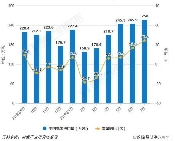 2018-2019年7月中國紙漿進口量、金額統(tǒng)計及增長情況