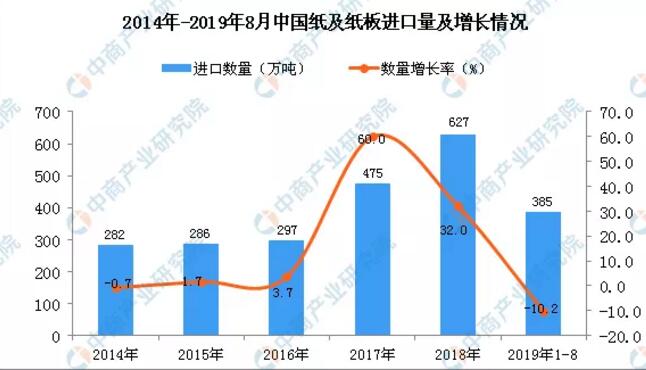 2019年1-8月中國紙及紙板進(jìn)口量為385萬噸同比下降10.2% 據(jù)中商產(chǎn)業(yè)研究院數(shù)據(jù)庫顯示,2019年1-2季度中國紙及紙板進(jìn)口量有所增長,2019年1-8月中國紙及紙板進(jìn)口量為385萬噸,同比下降10.2%。