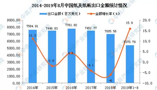 數(shù)據(jù)來源:中商產(chǎn)業(yè)研究院數(shù)據(jù)庫 從金額方面來看,2019年1-8月中國紙及紙板出口金額為5370.79百萬美元,同比增長15.9%。