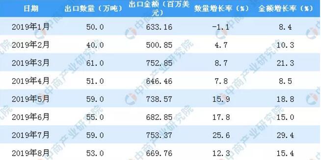 數(shù)據(jù)來源:中商產(chǎn)業(yè)研究院數(shù)據(jù)庫 2019年1-8月中國紙及紙板出口數(shù)量及金額增長率情況