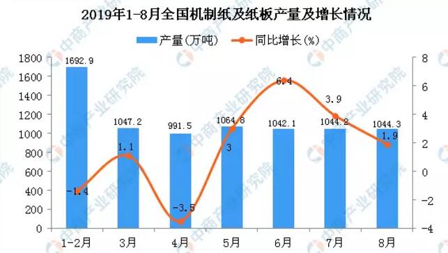 數(shù)據(jù)來源:中商產(chǎn)業(yè)研究院數(shù)據(jù)庫 2019年1-8月全國機(jī)制紙及紙板產(chǎn)量為8083.8萬噸同比增長1% 據(jù)中商產(chǎn)業(yè)研究院數(shù)據(jù)庫顯示,2019年1-2季度全國機(jī)制紙及紙板產(chǎn)量有所增長,2019年8月全國機(jī)制紙及紙板產(chǎn)量為1044.3萬噸,同比增長1.9%。2019年1-8月全國機(jī)制紙及紙板產(chǎn)量為8083.8萬噸,同比增長1%。