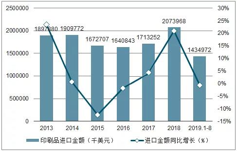 根據中國海關數據顯示:2019年1-8月中國印刷品進口數量為37568噸,同比下降8.6%;2019年1-8月中國印刷品進口金額為1434972千美元,同比下降0.7%。