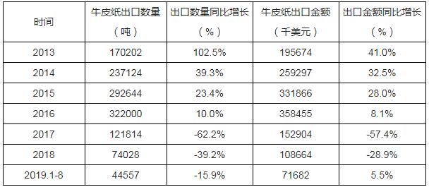 2013-2019年8月中國牛皮紙出口數量及出口金額統計表