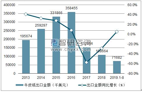 2013-2019年8月中國牛皮紙出口金額趨勢圖