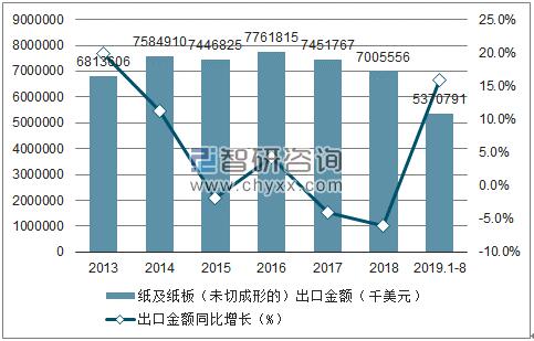 2013-2019年8月中國紙及紙板(未切成形的)出口金額趨勢圖