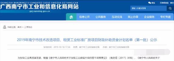 為加快工業高質量發展,廣西南寧市根據相關文件精神,擬安排符合條件的36項目列入2019年南寧市技術改造資金項目財政補助資金計劃名單(第一批)。
