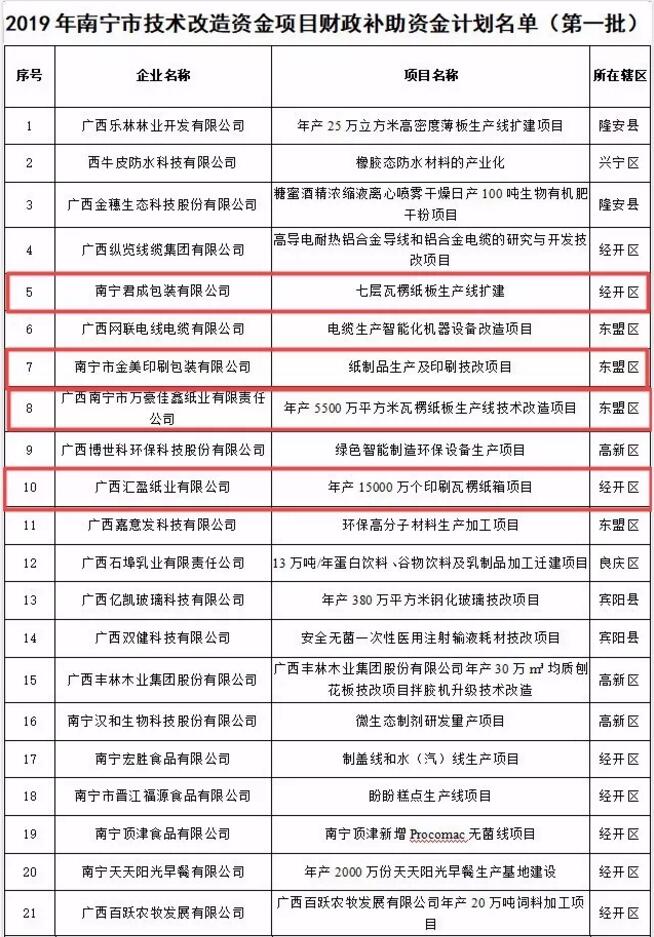 經梳理,筆者發現“第一批技術改造資金項目財政補助資金計劃名單”中,當地共有四家知名紙包裝企業的項目入選,分別是: 南寧君成包裝有限公司:七層瓦楞紙板生產線擴建項目; 南寧市金美印刷包裝有限公司:紙制品生產及印刷技改項目; 廣西南寧市萬豪佳鑫紙業有限責任公司:年產5500萬平方米瓦楞紙板生產線技術改造項目; 廣西匯盈紙業有限公司:年產15000萬個印刷瓦楞紙箱項目。 目前該份名單即將公示完畢,想必用不了多久,南寧市政府將會下發財政補助資金。在某種意義上,這不僅是對技改項目的資金扶持,更是對優秀企業的認可與重視。 具體名單如下: