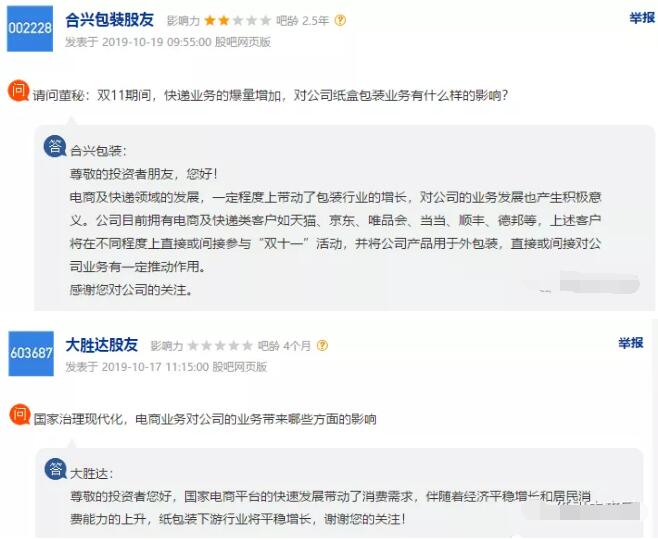 距離雙十一電商狂歡節尚有半個月時間,可隨著預售活動的開啟,各電商平臺的相關活動已經開跑。而這也使得商家提前備貨,導致紙箱需求得到較大提升,不少紙箱廠早在10月中旬便開始涌入大量訂單。與此同時,業內幾家上市企業,如合興包裝、大勝達等也都在互動平臺上收到投資者有關雙十一活動的提問: