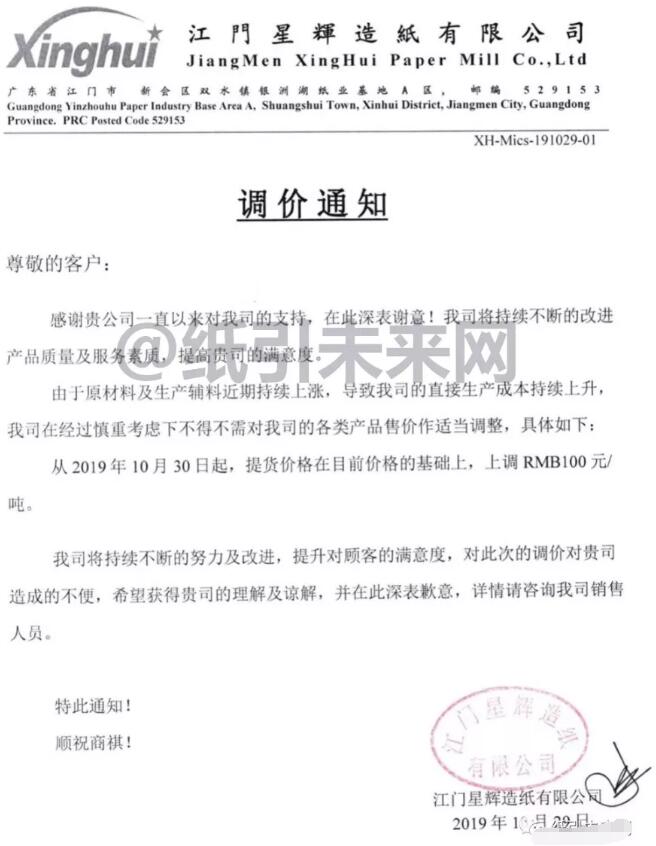 湖北長江匯豐紙業:因近期原材料上漲,特向廣大用戶作如下通知并敬請理解:從2019年11月1日起,我司單面涂布,白板紙在目前價格基礎上上調100元/噸。 江門星輝造紙有限公司:由于原材料及生產輔料近期持續上漲,從2019年10月30日起,提貨價格在目前價格的基礎上,上調RMB100元/噸。