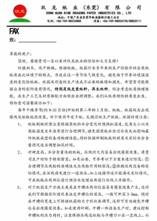 尊敬的用戶: 您好,感謝貴司一直以來對玖龍紙業的信任和大力支持! 時值初冬,風干物燥。根據紙板、紙箱行業多年來的生產經驗并結合原紙紙質在此環境下的特點,為適應這一季節性氣候變化,避免由于外界環境溫濕度的變化給紙板、紙箱及彩盒的生產造成不必要的麻煩和損失,希望貴司能根據自身的實際使用情況,特別是低克重紙種、再生紙種,綜合考慮紙質物理性能,在生產工藝及材質搭配方面做出合理調整。我們從紙質特性的角度出發,特給貴司溫馨提示如下: 每年干燥季節(約9-10月份)開始到第二年的3月份,紙板、紙箱極易出現爆線及紙板起泡現象,對于使用牛皮卡紙、瓦楞芯紙生產紙板、紙箱時請注意: 1、紙板制板時請注意根據原紙的水分變化對預熱缸溫度、包角大小以及熱板溫度及車速等進行合理調節,避免因原紙水分過分喪失而影響最終紙板成型的各項物理性能。同時依據所制紙板的材質及實際水分含量情況適當調整抽風時間。 2、對硬度高、水分含量低的紙板,壓線時尤為容易出現爆裂現象,請貴司生產時給予特別留意。如有必要,可參考以下方案來進行防范: 、俸侠碚{節壓線輪的準確性及壓線輪作用的深淺; ②依據壓線設備的實際情況,在壓線請先進行一道預壓。 如上述操作還不能滿足實際情況,可在紙板壓線部位進行預涂水處理后再進行壓線工序操作。 3、對于紙箱生產方面主要是在開槽壓線部位容易有爆裂現象產生,這時我們可根據實際情況來決定開槽位的深淺,一般可開深3-5mm,同時在開槽的寬度上可根據紙箱的尺寸形狀來調節,這樣可有效避免開槽位易出現爆裂現象。如是使用印刷、開槽一體設備生產時,建議控制開槽機的壓力同時,注意保持壓線送紙輪與開槽刀口在一直線上。而對于使用了模切設備進行模切開槽時,在控制好模切壓力同時可考慮在模切刀邊增加膠墊,以延長緩沖的時間及模切刀口直接接觸紙板的時間,同時最好能使用寬刀口的模切壓線刀。 4、由于天氣濕度因素影響,建議雙面機紙板生產出來后最好在8個小時內完成后續工序。如果無法在此時間完成,而紙板又容易爆線,建議對車間進行調濕處理,如在紙板周圍撒水以增加空氣中的濕度。 5、紙板材質搭配的調整,要避免出現面底紙克重相差懸殊情況及根據紙板強度及季節特點適當調整原紙材質。 6、對于生產低克重紙種時, 需特別注意調整漿糊濃度和張力,控制好紙板水分,適當抽濕,避免水分過大或生產后即刻裝車車廂密閉等原因造成紙板起泡等不良。 以上管見,請予指正。 在此感謝貴司對我們工作的支持與配合,希望貴司能針對產品的特性和季節特點合理調節、適當評估生產。如在實際的生產、工作中產生疑慮和困惑,請及時聯系我們。 為了進一步穩定和改善我司產品的質量,更好地滿足貴司的使用要求,加強雙方長期穩定的合作,希望貴司對我司的產品多提寶貴的意見和建議,使大家相互促進、共同提高。謝謝! 二、入秋紙板爆線高發期!"防爆"實用技巧,各位老板請收下! 此外,小編還為大家整理了技術專家團隊此前分享的一些“防爆”實用技巧,希望對大家有所幫助。 1、印刷機壓線爆線 一般情況下,低克重、低等級材質的紙板,在冬季爆線的幾率是非常大的。但是,現在很多紙箱廠使用的都是高等級的紙板,如果還出現爆線,那我們就要考慮一下紙箱壓線的問題了。 印刷的壓線分為預壓和正式壓線,預壓輪主要起到粉碎瓦楞的作用,把瓦楞壓潰后,使之更有利于紙箱壓線成型。壓線輪的正確調整及設備改進可以減少爆線的發生。 壓線的不同種類: