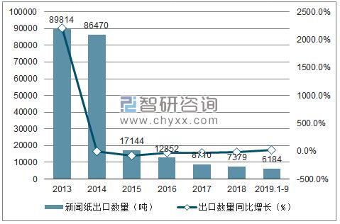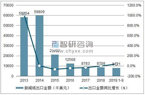 2013-2019年9月中國(guó)新聞紙出口數(shù)量及出口金額統(tǒng)計(jì)表
