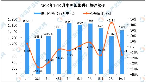從金額方面來(lái)看,2019年10月中國(guó)紙漿進(jìn)口金額為1429百萬(wàn)美元,同比下降14.7%。