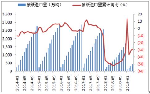 數據來源:公開資料整理 進口廢紙趨嚴是在環保被提升到新的政治高度后,限制進口洋垃圾的大背景下的舉措,中周期廢紙進口持續趨嚴,2020年禁止外廢進口成為大的政策導向。2019年1-4月份我國累計進口廢紙423萬噸,同比減少29%,預計全年同比進口量將減少40%以上。 2019年1-4月份廢紙進口量同比減少29%