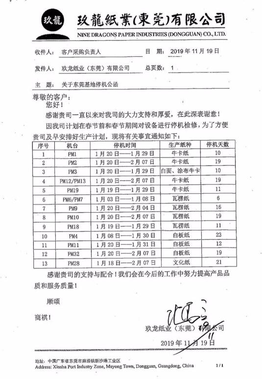 導語:這兩天,與漲價齊來的還有大型紙廠的2020春節停機函也接踵而至。繼理文造紙近日發布停機函后,東莞玖龍、太倉玖龍也拋出了春節停機通知。東莞玖龍將于2020年1月8日起13臺紙機停機6-23天,總時長196天。太倉玖龍將于1月14日起8臺紙機停機3-6天,總時長35天。在此提醒華南、華東的包裝印刷廠提前安排好生產計劃,以免造成不便! 1、東莞玖龍:1月8日起13臺紙機停機6-23天,總時長196天