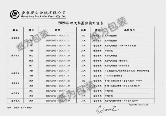 理文造紙早前于11月5日已對外公布2020年春節停機計劃表:從2020年1月12日起到1月31日止,理文國內外六大生產基地共有14臺紙機將錯時停機,停機時間在6-20天不等,總時長166天。預計減產近20萬噸。 提醒:根據國務院最新發布的2020年放假安排表,2020年春節假期將于1月24日(除夕)開始。相比往年,今年春節來的有點早。后續也將有更多紙廠陸續發布春節停機計劃,請各下游紙板紙箱廠提前做好計劃!