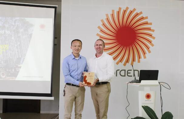 北海工廠總經(jīng)理朱偉言(左)向林業(yè)總經(jīng)理勃朗登贈送紀(jì)念牌 2019年11月13日,斯道拉恩索廣西林業(yè)向北海工廠交付第100萬方機(jī)械采伐木材原材料慶祝儀式在鐵山港舉行。斯道拉恩索重要的合資伙伴廣西林業(yè)集團(tuán)、北海林業(yè)投資有限公司的代表,及來自斯道拉恩索林業(yè)運營周邊鄉(xiāng)鎮(zhèn)政府代表們共同見證了這一重要時刻。